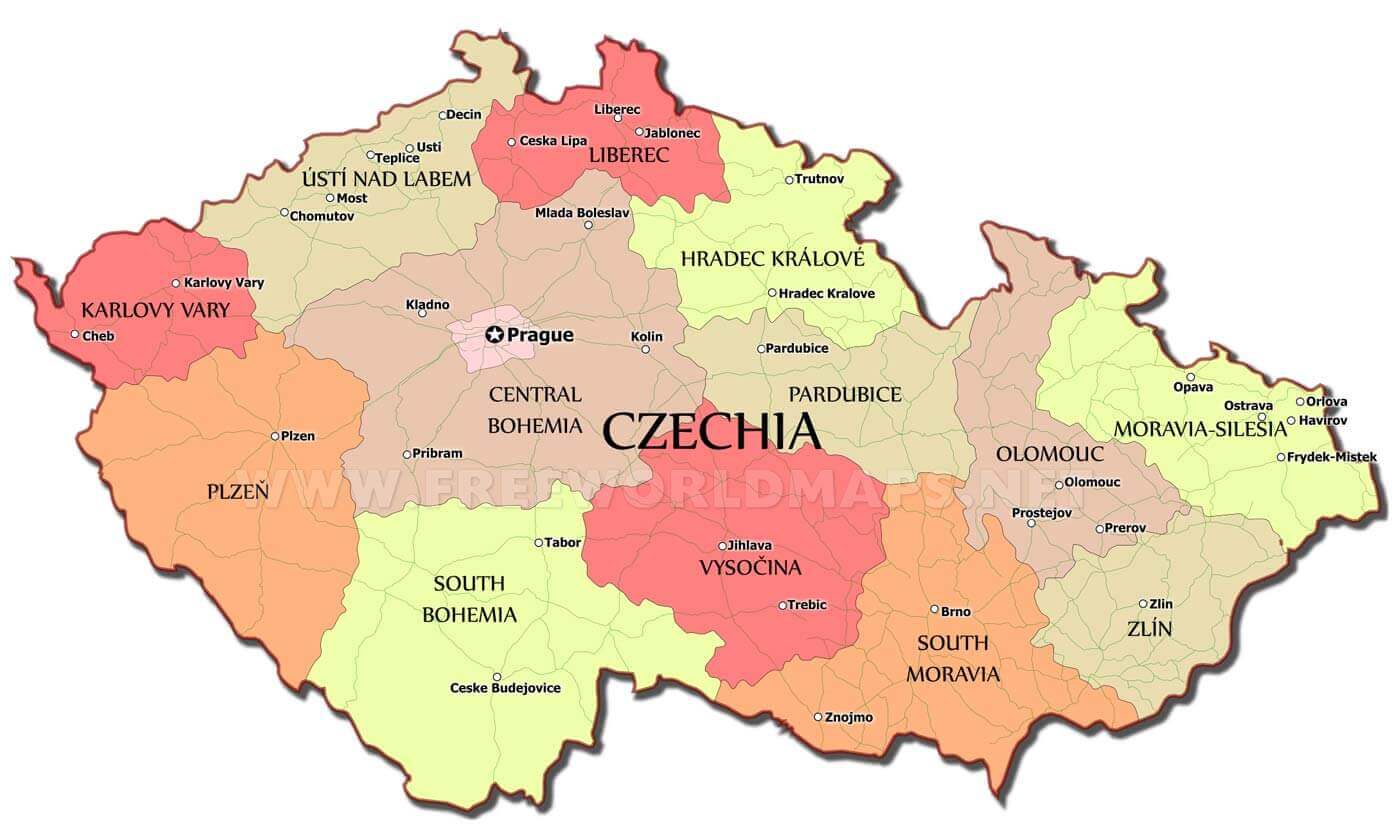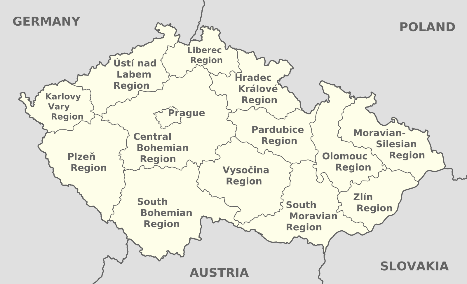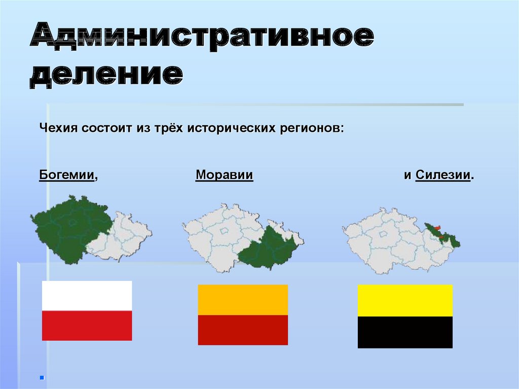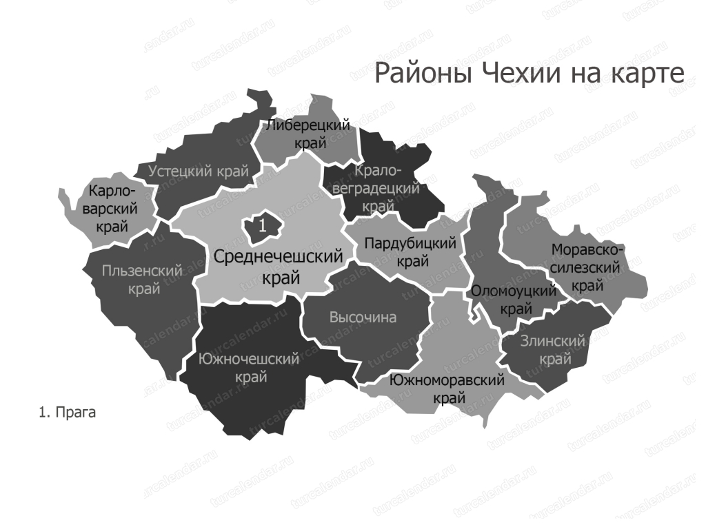 Чешская Республика разделена на 13 регионов ( kraje , sing. kraj ) и 1 столицу ( hlavni mesto ).Регионы: Среднечешский, Южночешский, Высочина, Пльзенский, Карловы Вары, Усти-над-Лабем, Либерец, Градец-Кралове, Пардубице, Оломоуц, Моравскосилезский, Южно-Моравский и Злинский. Прага (Прага) — столица. Регионы делятся на районы и более мелкие муниципальные образования.