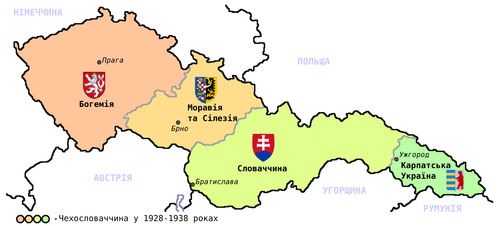 Богемия, занимающая в основном западную половину страны, состоит из низменного бассейна, истощенного реками Эльба и Влтава. Моравия, покрывающая восточную часть страны, представляет собой холмистую местность, осушаемую в основном рекой Моравой