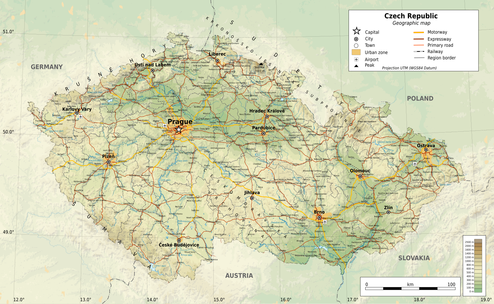 Самая высокая точка — Mt. Снежка в Судетских горах; он поднимается до 5 259 футов (1 603 м). Самая низкая точка в Чешской Республике находится на реке Эльба на высоте 377 футов (115 м). Вертикальный перевернутый желтый треугольник отмечает положение этих крайних точек на карте.