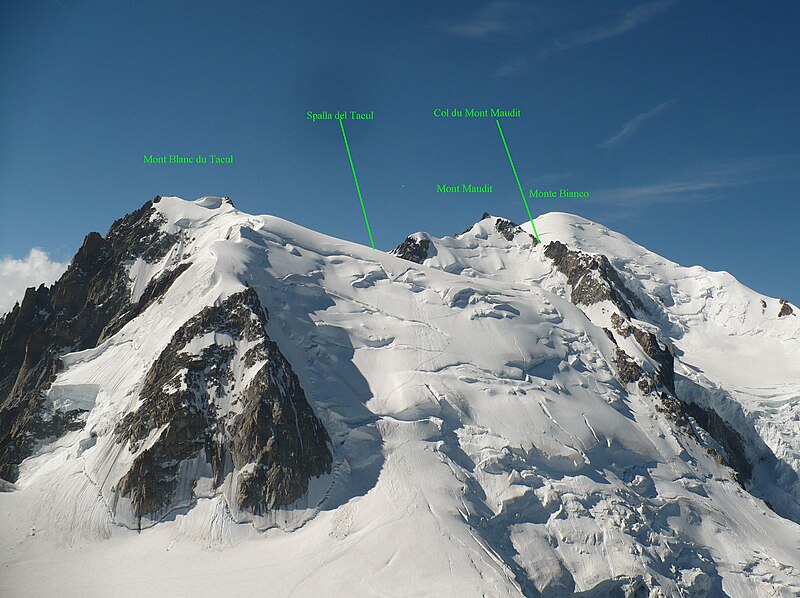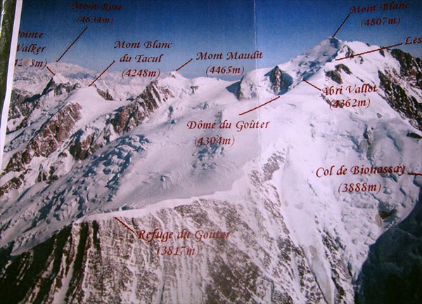 Существует стереотип, что Монблан — вершина. Это не совсем так, поскольку Монблан — горный массив протяженностью 50 километров, имеющий несколько вершин. Всего их насчитывается 19 штук. Самой низкой является гора Эгюий-дю-Миди (3842 м), а самой высокой — Монблан (4810 м). Поскольку название массива и одной из вершин совпадают, возникла путаница. Далее по высоте следует Монблан-де-Курмайёр (4748 м), а тройку лидеров замыкает Роше-де-ла-Турмет (4677 м). Все вместе они образуют цепочку гор, похожую на зубчатую корону.