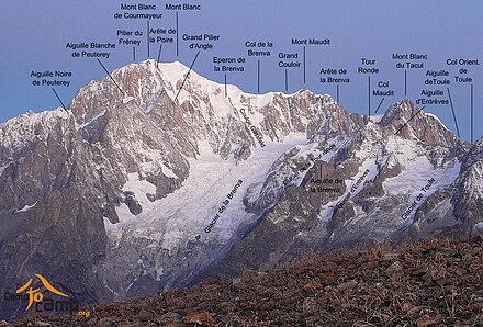 Например, Роше-де-ла-Турмет ниже Монблана на 100 метров, а Монблан-де-Курмайор — всего на 60 м. Назовем и другие известные среди альпинистов горы этого хребта: Гранд-Жорас, которая отвесна настолько, что считается одной из сложнейших в Альпах для восхождения, и Эгюий-дю-Миди, славящаяся своей канатной дорогой и потрясающими видами солнечного заката.