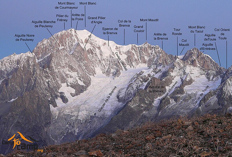 Монблан (французский) и Монте Бьянко (итальянский) означает «Белая гора» из-за ее вечных снежных полей и ледников. Огромная куполообразная гора окружена белыми ледниками, гранитными гранитными стенами и великолепными альпийскими пейзажами.