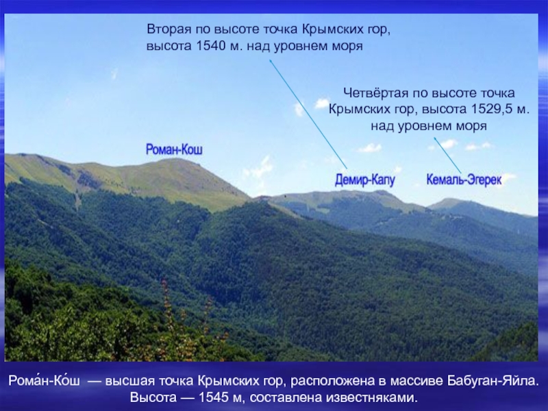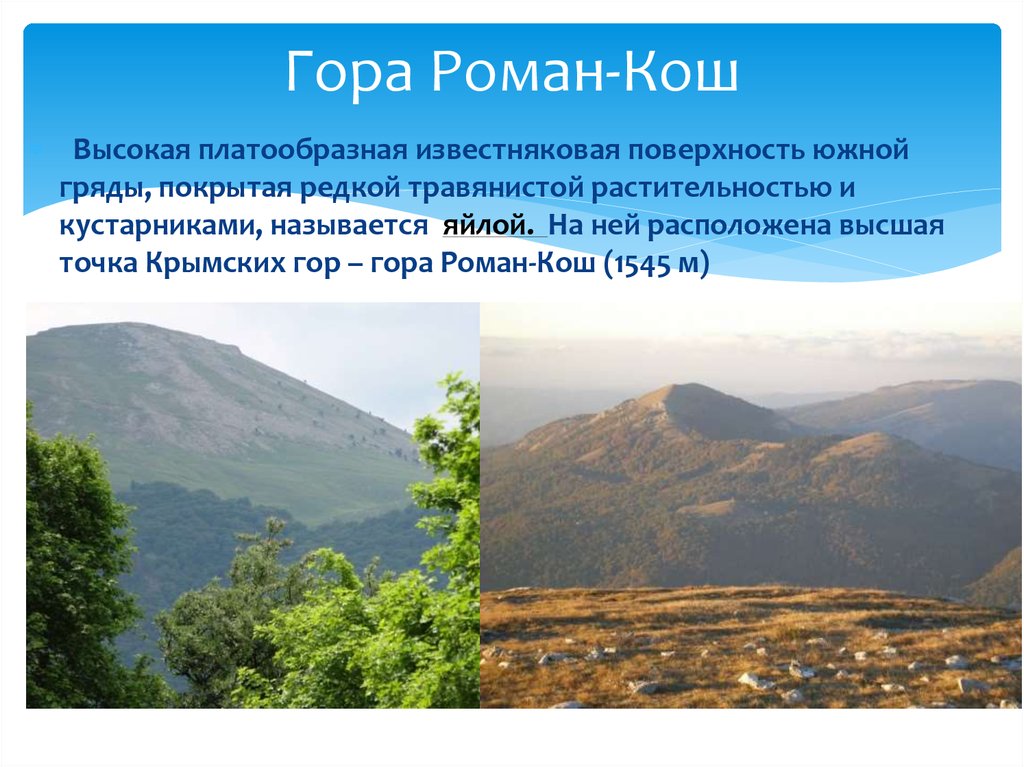 Гора Роман-Кош находится в юго-западной части горного массива Бабуган-Яйла и является памятником природы. Хотя высота горы Роман-Кош 1545 м над уровнем моря, но с Южного берега Крыма она не видна, так как юго-западнее её находятся почти такие же высокие вершины Кемал-Эгерек (1529 м), Демир-Капу (1539 м) и другие высокие (более 1400 м) горы, стоящие на стыке Никитской, Гурзуфской и Ялтинской яйл…
