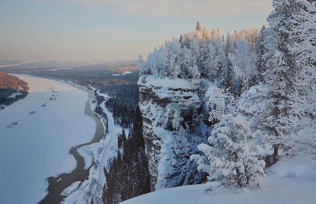 Сквозь прозрачный лед видно дно реки. - Усьвинские столбы в Пермском крае ещё одно интересное место, которое можно посетить во время отдыха на Урале зимой. Это довольно необычное место удивит скальными массивами. Известняковые столбы до 120 метров высотой поднимающиеся над рекой Усьвой, не что иное, как чаша древнего моря. В толще известняка можно увидеть отпечатки древних морских животных. С высоты скальных массивов открывается красивый вид на окрестности реки, которые зимой имеют сказочный вид.