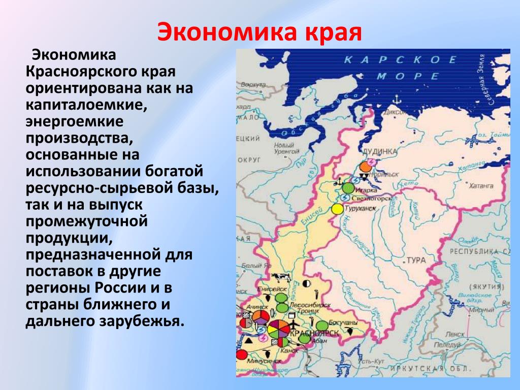 Главные промышленные центры: Красноярск, Норильск, Назарово, Шарыпово, Канск, Железногорск.