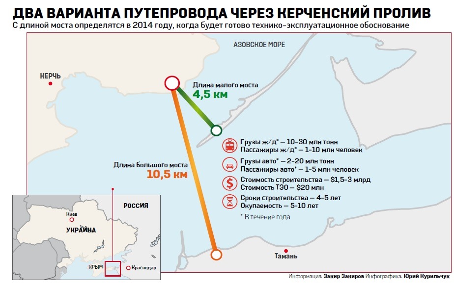 Мост через Керченский пролив — вполне осуществимый проект. Во время Второй мировой войны мост через Керченский пролив уже был построен. В 1943 г. фюрер Германии Адольф Гитлер потребовал возвести автомобильный и железнодорожный мост длиной 4,8 км, чтобы совершить бросок на нефтяные районы Кавказа и Персии, но эта затея провалилась, когда немцев изгнали из Крыма.