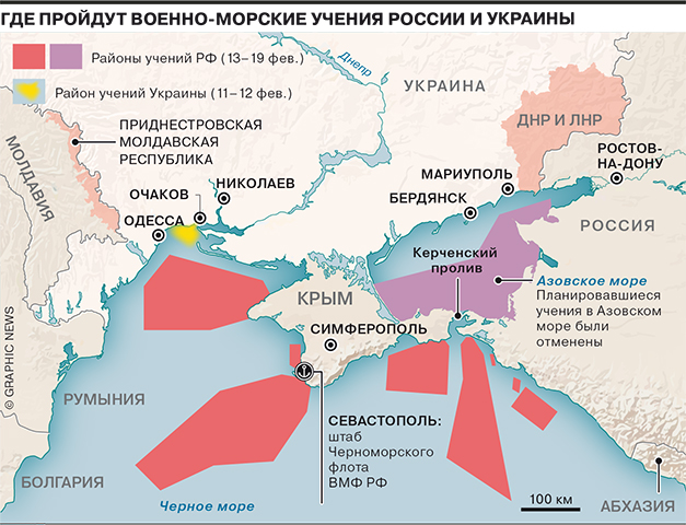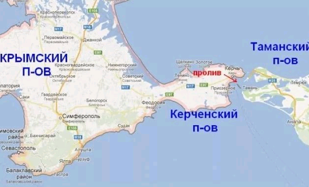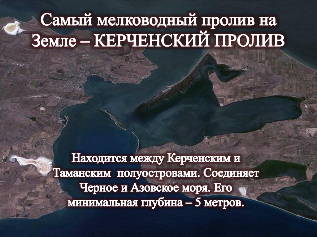 Керченский пролив между Керченским (Крым) и Таманским (Кавказ) полуостровами соединяет Азовское и Черное моря. Крайние мысы — Ак-Бурун на Керченском полуострове (Украина) и мыс Тузла на Таманском (Россия). Глубина Керченского пролива — от 5 до 15 м. Берега Керченского полуострова возвышенные, Таманского — низкие, изрезанные бухтами, заливами и лиманами.