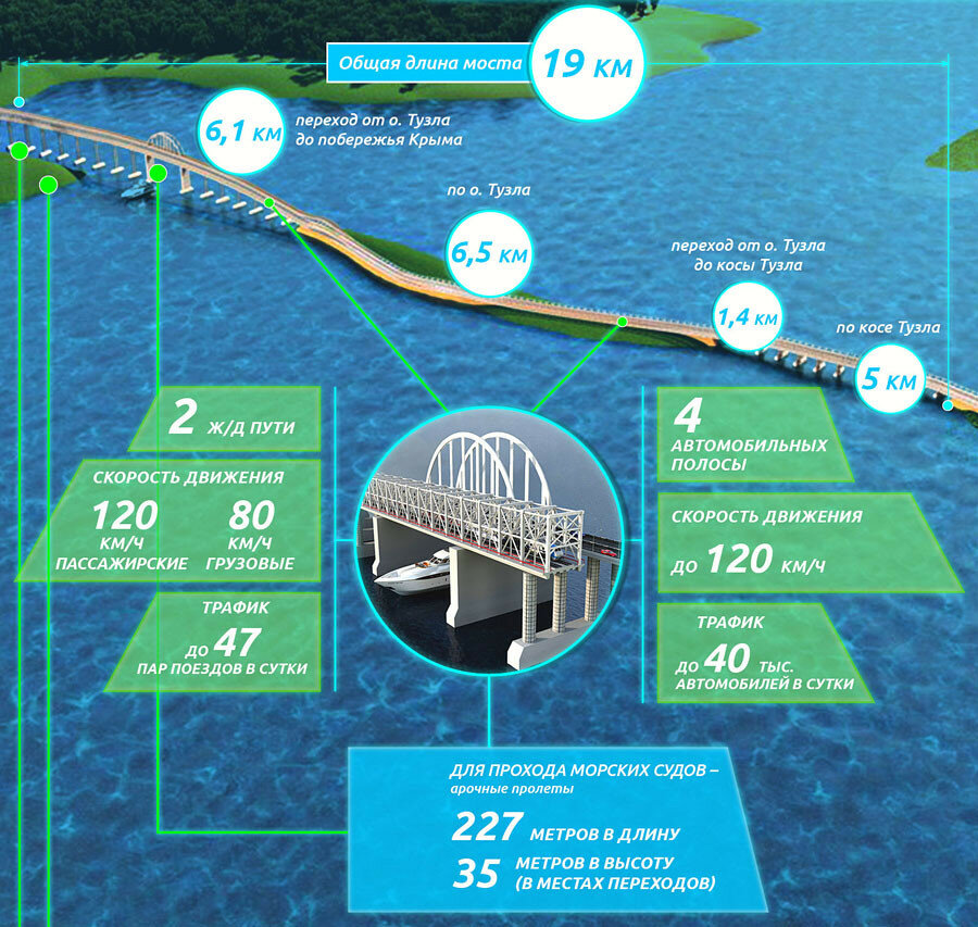 После присоединения Крыма к Российской Федерации, стало необходимым строительство моста, как средство соединения всех путей сообщения и обеспечения комфортного транспортного передвижения, на полуостров Крым. Эта грандиозная конструкция будет нести четыре полосы дорог для автомобилей и две железнодорожные колеи, длина моста будет достигать 19 километров.