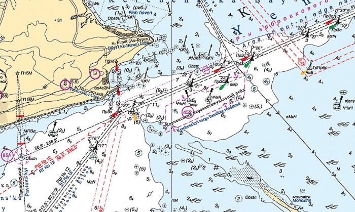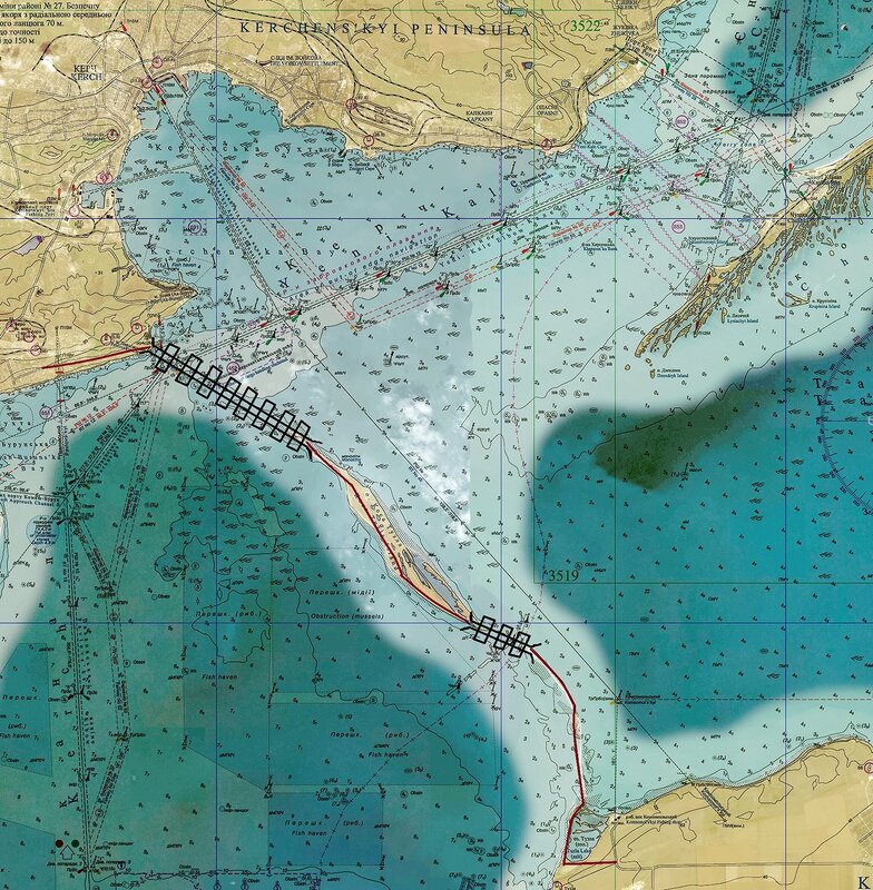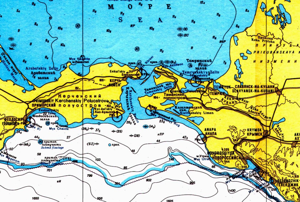 Керчь-Еникальский канал [не канал], который был впервые построен в 1877 году и раньше эксплуатировался Украиной, является единственным водным путем через Керченский пролив, по которому судоходны большие суда. Суда меньшего размера могут использовать российские фарватерные проходы № 50 и № 52, расположенные к востоку от канала. В среднем через Керченский пролив ежегодно проходит около 20 000 судов. Керченский пролив [Керченский пролив], соединяющий Черное море с Азовским, имеет длину 27 миль, а ширина колеблется от 8 миль у его южного и северного входов до всего 1 мили в узком месте между мысом Павловского (Павла) и коса Тузла.