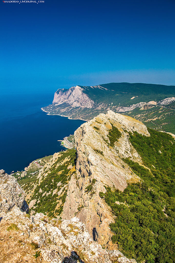 С вершины горы открываются восхитительные виды во все стороны. С юга виден мыс Сарыч – самая южная точка Крыма. На востоке — гора Челеби-Яурн-Бели.