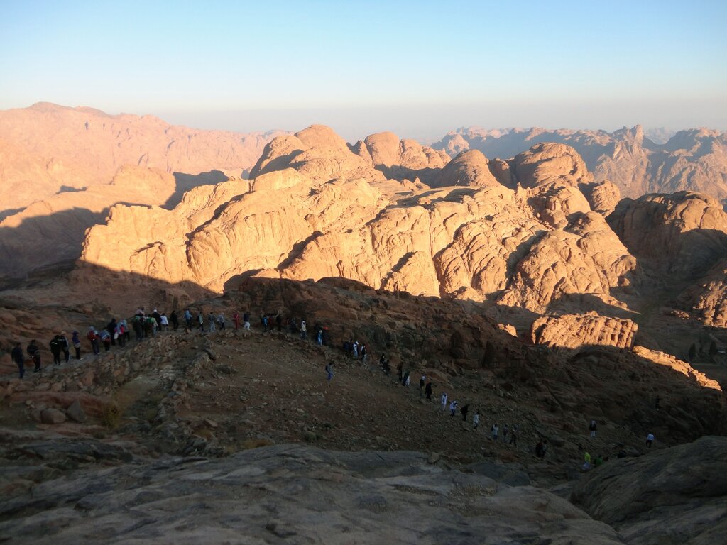 Когда показалось солнце, группа румынских паломников запела гимн. Их громкие голоса создавали почти жуткий саундтрек к восходу солнца. Остальные из нас спокойно смотрели на Синайскую пустыню, когда свет начал излучать теплое сияние, открывая скалистые вершины вокруг нас. Горы стали малиновыми, золотыми и оранжевыми, и я почувствовал, как мое настроение поднимается от солнечного тепла.
