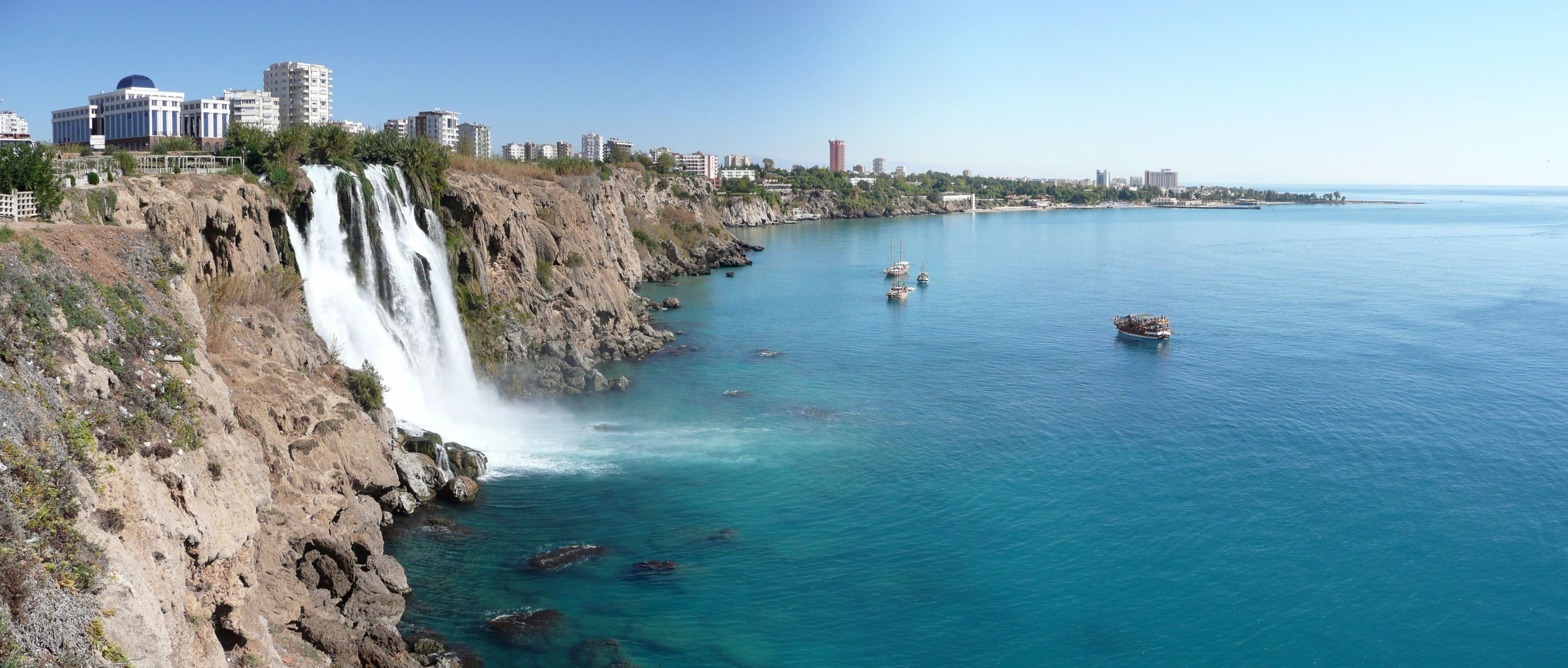 «Природное чудо света» многие считают визитной карточкой Анталии. Это целая группа водопадов, образованная в результате многочисленных порогов реки Дюден. Нижняя часть водопада — это мощный поток воды, обрушивающийся в Средиземное море с высоты 40 метров. Он считается красивейшим водопадом мира. Увидеть Дюден можно с обзорной площадки на берегу. Но самое захватывающее зрелище открывается, если подплыть к водной стихии с моря на лодке. Вы почувствуете мощь тонн воды и сделаете уникальные снимки на фоне водопада. В окрестностях на берегу разбит уютный парк с многочисленными лавочками и кафе. Особенно красив водопад вечером. Он подсвечивается разноцветными огнями, создающими неповторимую романтичную атмосферу.