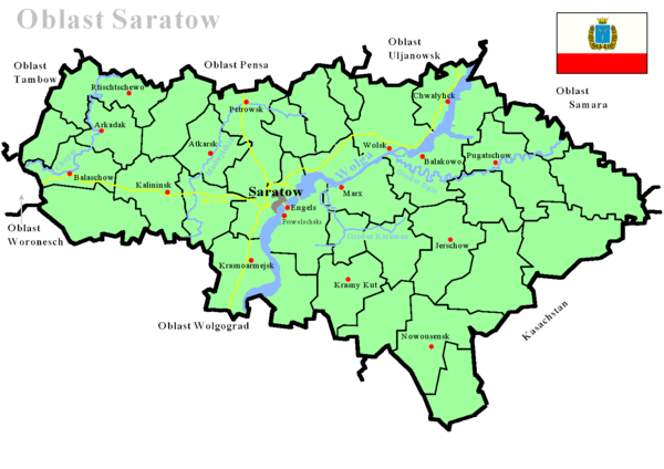 Основные города: Саратовская область состоит из 38 районов и 18 городов. Крупные города области: Саратов, Балашов, Вольск, Балаково, Энгельс.