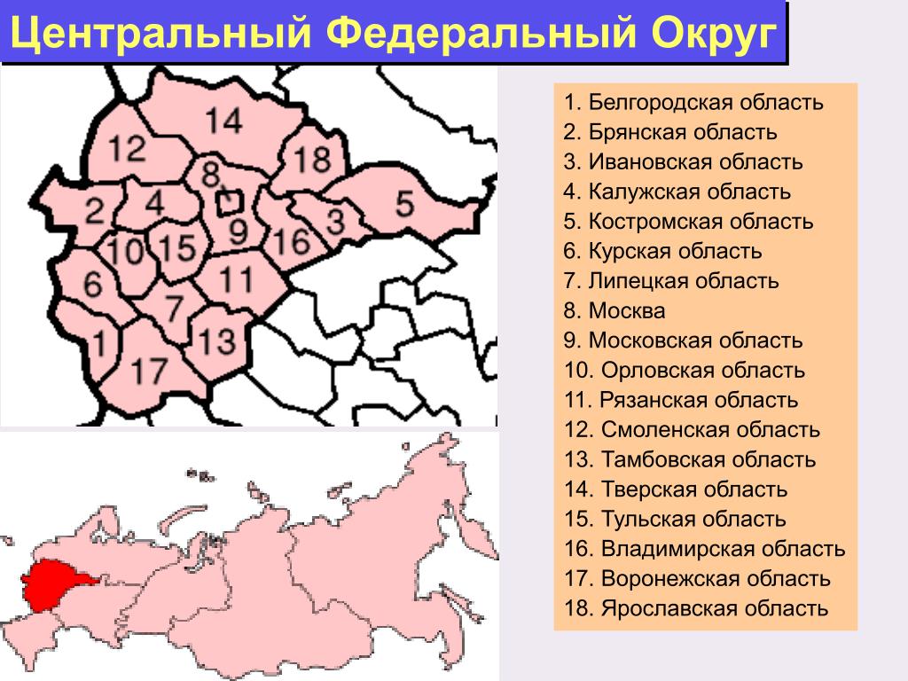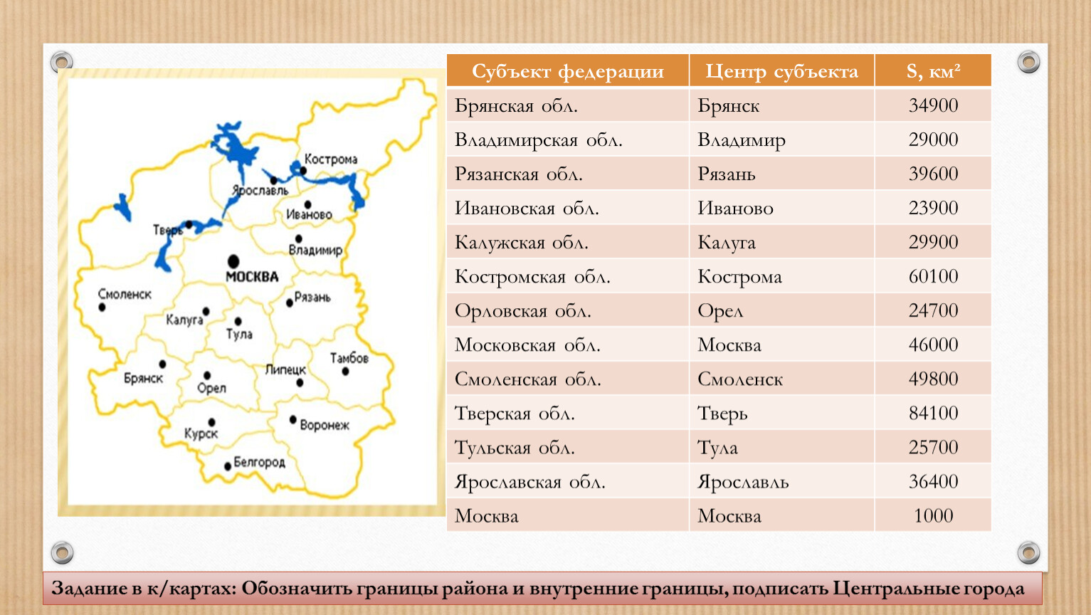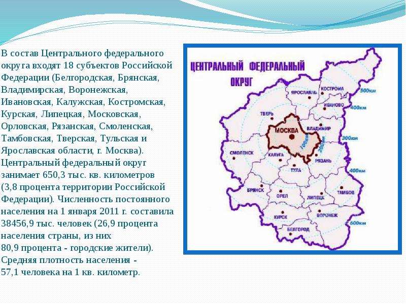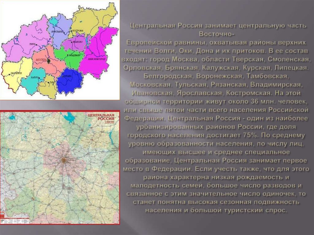 Определяющими экономический потенциал Центральной России являются такие крупные города, как Ярославль (концентрирует 47% населения области), Рязань (85% основных фондов области), Орёл (86% обрабатывающих производств области, Киров и Брянск (71% и 70% соответственно концентрируют строительство жилых домов регионов), Рязань и Тамбов (82% оборота розничной торговли соответствующих регионов). Роль этих городов в экономике субъектов РФ увеличивается, что, с одной стороны, свидетельствует о развитии экономических центров, с другой, о «стягивании» ресурсов в крупные города, их отсутствии или оттоке из средних и малых городов.