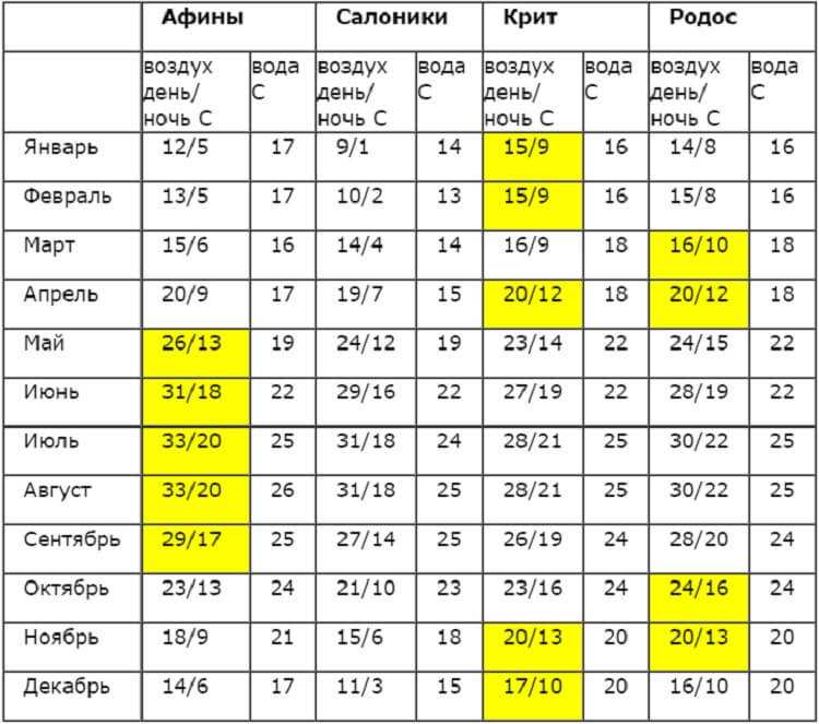 В целом с мая погода на всех островах Греции, имеющих выход к Средиземному морю, становится на удивление одинаковой. Это касается и температур воздуха и моря, и влажности. Лишь с июля, когда на Крите во всю свою силу начинает дуть сезонный ветер «Мелтеми», намечается заметная разница. В это время Родос более гостеприимен для туристов.