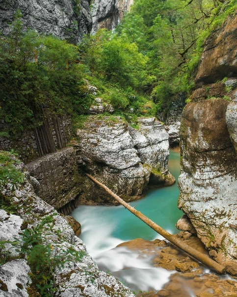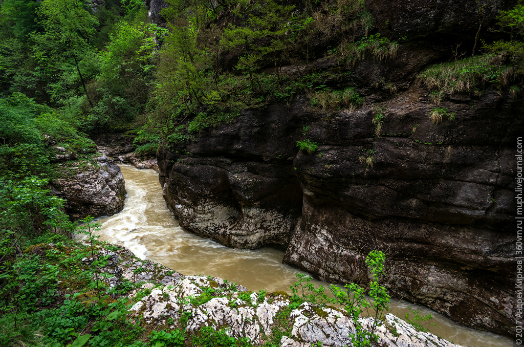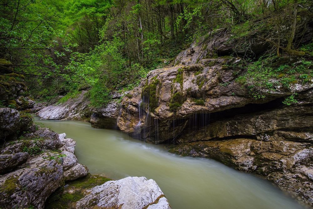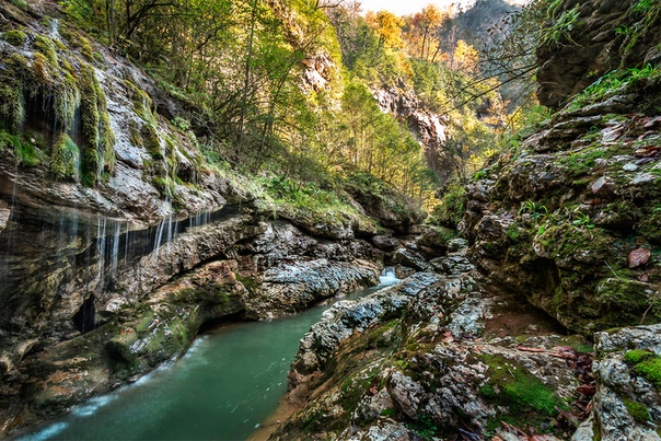 Скальные склоны возвышаются над рекой на 600 м, а с них стремительно срываются вниз красивые каскадные водопады. Ущелье поросло самшитом, пихтой, буком, ясенями и высокогорными кленами, а подлесок занимают заросли можжевельника, боярышника, кизила, азалии и шиповника. На горных склонах обитают медведи, кабаны и куницы, а над скалами часто можно увидеть парящих орлов.