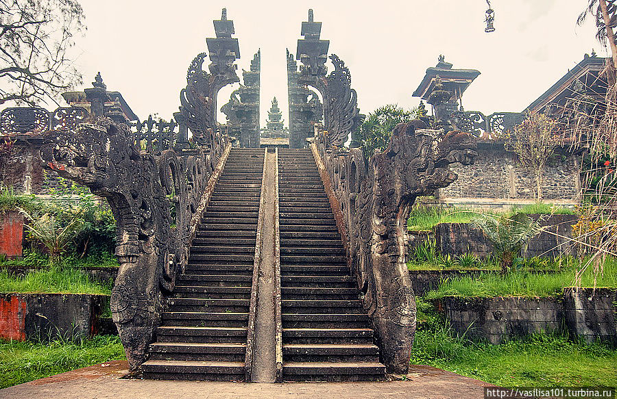 Лестница ведет через монументальные раздельные ворота во внутренний двор главного храма Пура Панатаран Агунг, где центральная святыня, посвященная индуистской троице Шивы, Брахмы и Вишну, обернута тканью и украшена цветочными подношениями.