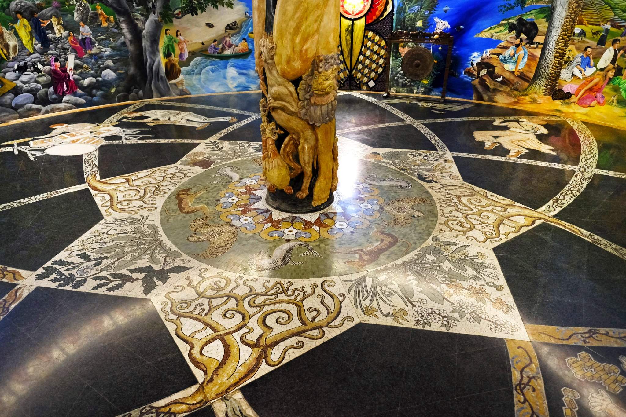 Стены украшены мозаикой из стекла и камня , картинами, скульптурами, вставками из дерева, меди и тиснением .Следуя по артикулированной дорожке, мы обнаруживаем семь комнат Храмов, каждая из которых посвящена определенному элементу и характеризуется своим мистическим характером. Первый — Зеркальный зал , посвященный свету, воздуху, небу и солнцу, со стеклянным куполом и полом из гранита и мрамора.