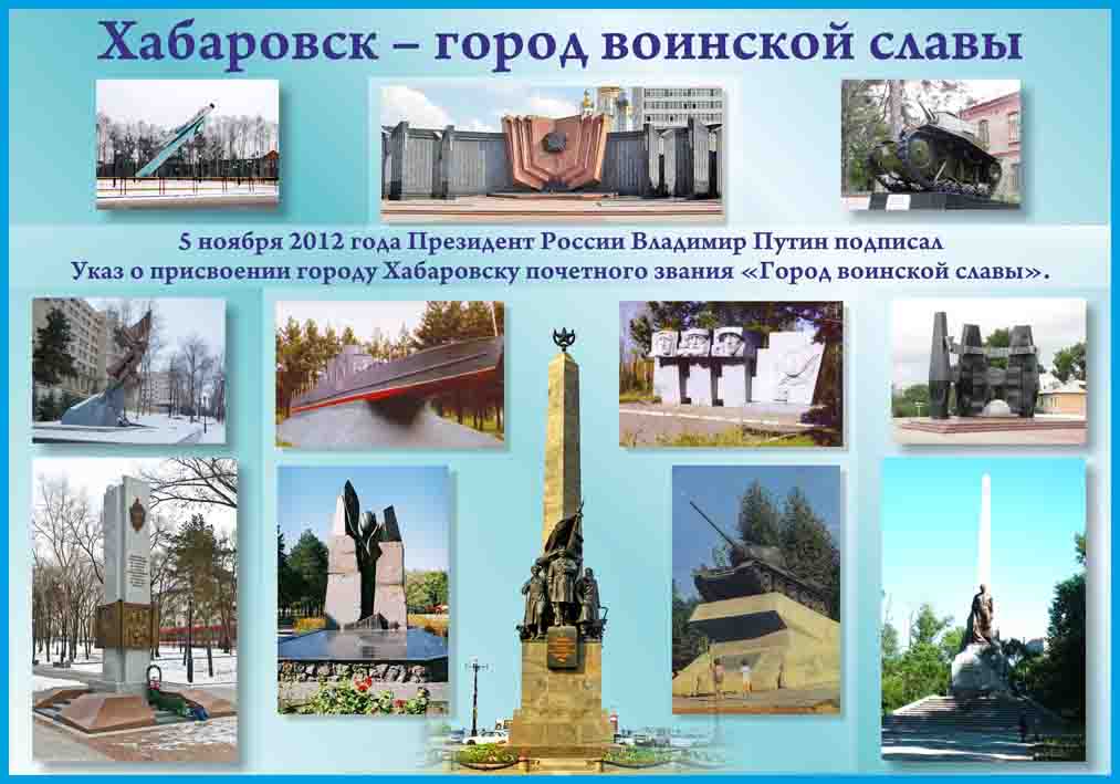 Хабаровск стал 40-м городом, которому присвоено столь высокое звание. В 2015 году в честь этого события открыли стелу высотой 16,5 метров. Она располагается на одноименной площади. Венчает стулу золотой двуглавый орёл. Вокруг территория выложена плиткой, организованы удобные подходы к памятнику, сделаны ограды и лестницы, а также в небольших клумбах в тёплое время года высаживаются цветы.