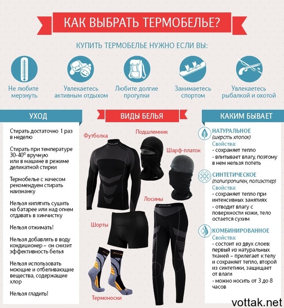 Короче, когда на улице холодно. Термобелье можно носить для традиционных зимних занятий на открытом воздухе, таких как охота, подледная рыбалка и катание на снегоходах, но этим не ограничивается. Многие из лучших комплектов термобелья достаточно тонкие, чтобы их можно было использовать под повседневной одеждой, и они согреют вас, когда вы работаете на улице или по делам.