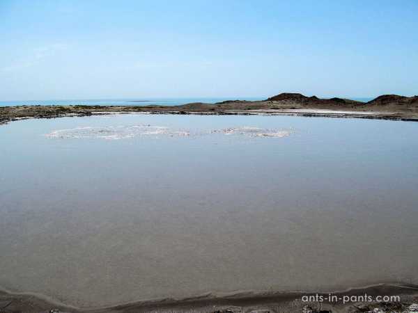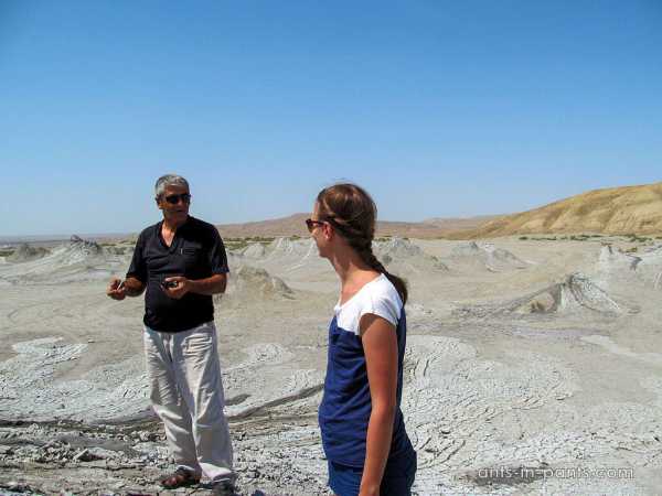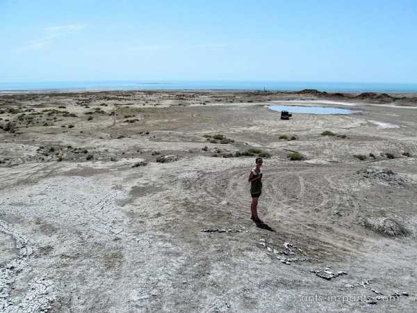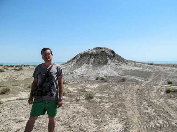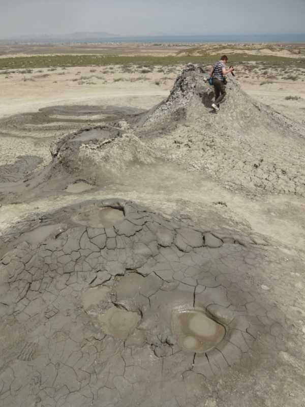 Азербайджан. Грязевые вулканы Гобустана.Забравшись на вулкан, мы увидели кратер около 3 метров в диаметре с многочисленными пузырями. Этот вулкан уже был куда серьезнее своих меньших собратьев и даже булькнул так, что забрызгал Сережины джинсы.