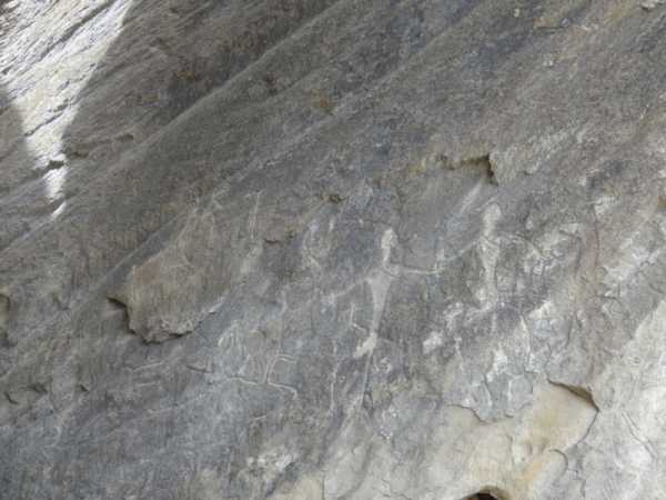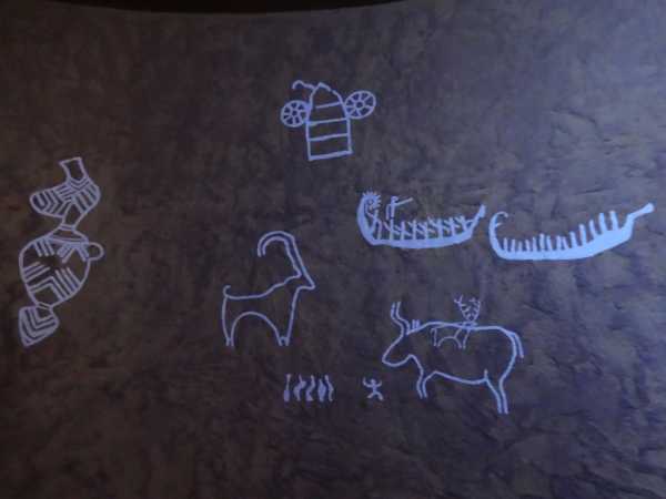 А вот и первые наскальные рисунки. Хорошо просматриваются фигурки людей и лодка.