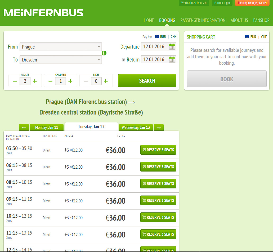 Отправляется ежедневно в 23.55 ночи и прибывает на остановку рядом с центральном ж/д вокзалом Dresden, Hbf (Bayrische Straße) в 6.55 утра. Самое время для того, чтобы позавтракать в кафе и отправиться на прогулку по городу.
