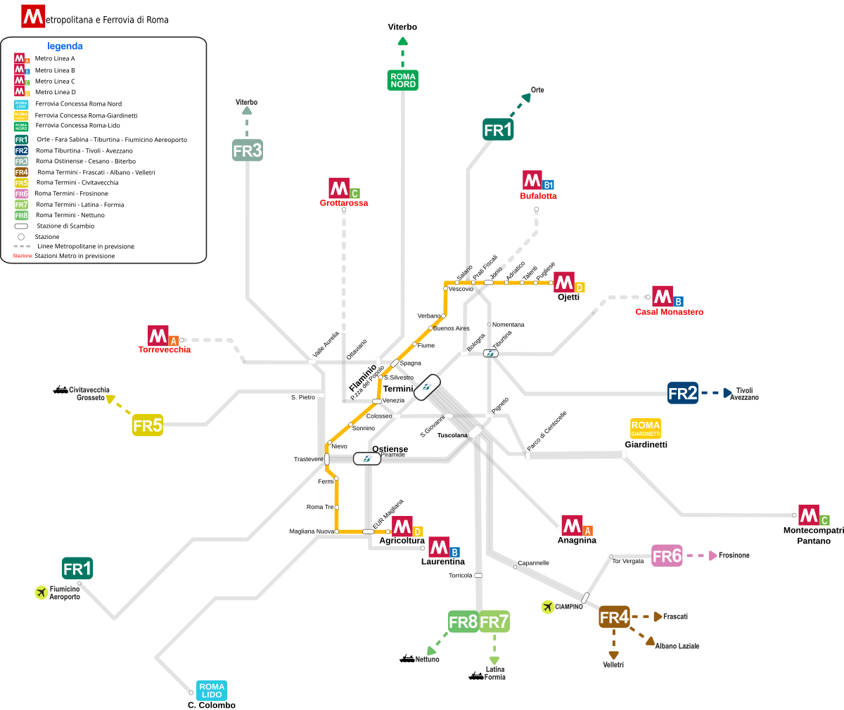 Туристам более интересны пригородные электропоезда, линии которых обозначены как FR 1–8. Именно они доставляют в новый аэропорт Фьюмичино (по линии FR1) и старый Чампино (линия FR6).