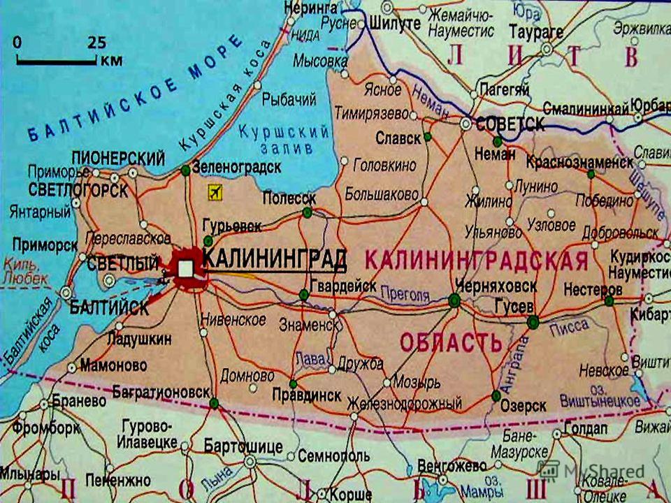 Так, съездив в Тильзит (Советск), можно осмотреть руины Тильзитского замка, мост королевы Луизы, дом Мюллер-Шталя и виллу Франка. Город расположен в 120 км от Калининграда. В Черняховске сохранились замок Инстербург, католический храм Святого Бруно, несколько частично сохранившихся городищ, башня Бисмарка. Расстояние между городами составляет 95 км. В поселке Янтарном гостям будет интересно осмотреть музейный комплекс «Янтарный замок». Расстояние – 50 км. В Гвардейске сохранился знаменитый замок Тапиау, строительство которого относится аж к 14 веку. Расстояние – 20 км. Интерес также представляют Неман (130 км), Балтийск (43 км), Полесск (50 км) и небезызвестная Куршская коса.