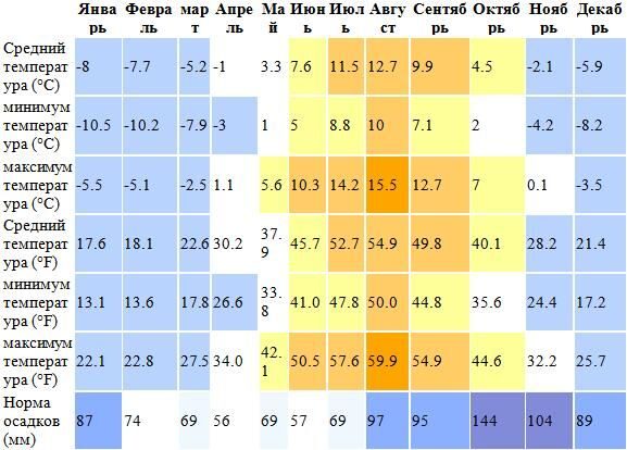 Лучшие месяцы между июнем и августом, и я согласен. Летом температура находится в середине 20-х (градусов Цельсия). Затем наступает осень, и температура падает до 10 градусов по Цельсию. Осень с августа по ноябрь. Зима очень холодная, бывает до минус 20 градусов, но это не норма. Температура обычно колеблется от 5 до минус 11 градусов.