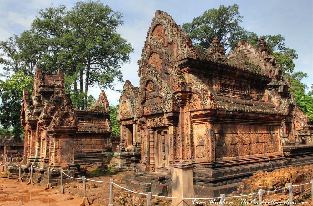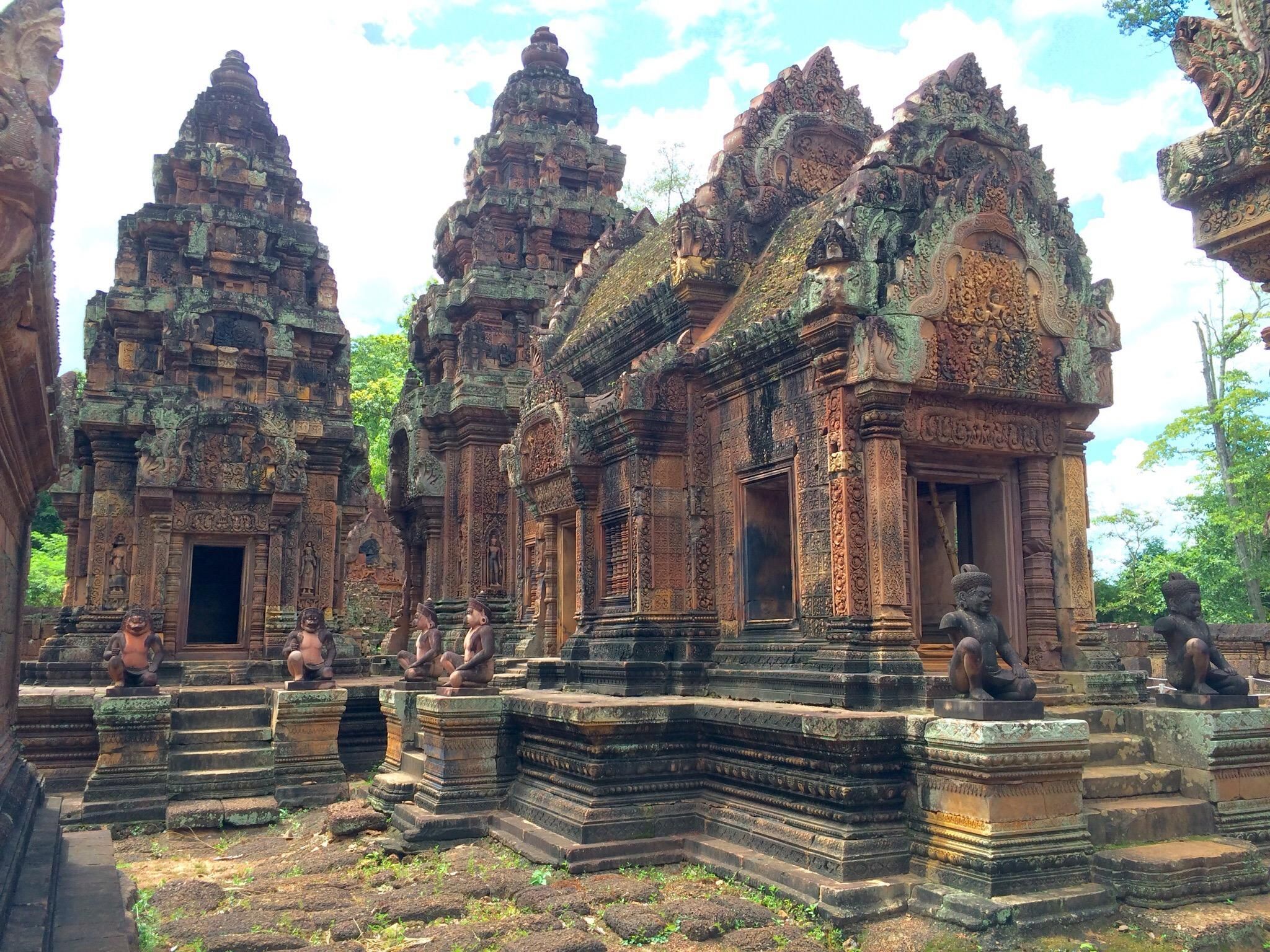Красивые резные фигурки Бантей Срей.Бантей Срей — камбоджийский храм, который часто называют «жемчужиной кхмерского искусства». Он чрезвычайно популярен среди туристов, которые посещают это место, чтобы полюбоваться его красотой. Бантей Срей — храм 10 века, расположенный недалеко от холмов Пном Дей в районе Ангкора. Храм посвящен лорду Шиве, индуистскому богу. .Здание построено из красного песчаника с искусной резьбой.