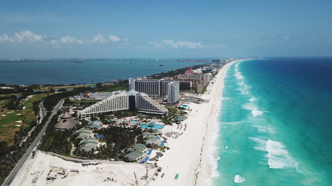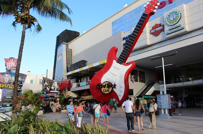 Гостиницы, рестораны, торговые центры и ночные клубы расположены по обеим сторонам бульвара Кукулькан , известного как Гостиничная зона , которая проходит посреди 15-мильной песчаной отмели.