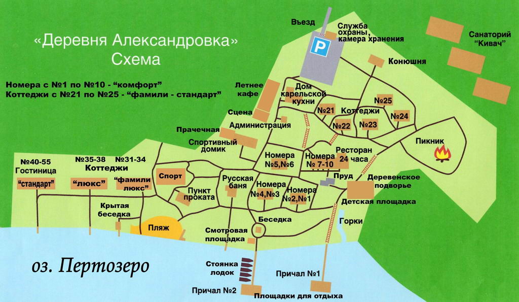 Туристический центр «Деревня Александровка» расположенный в Карелии — это современная комфортабельная база отдыха, построенная в стиле карельского поселения, рассчитанная на 250 человек. Расположена на берегу одного из самых чистых озер Европы – озера Пертозеро (озеро Петра 1), в 50 км от столицы Карелии г. Петрозаводска. На севере – заповедник Кивач со знаменитым водопадом и заповедником, а в нескольких километрах западнее – первый российский курорт «Марциальные воды», построенный по проекту Петра 1.По итогам ежегодных конкурсов правительства Республики КАРЕЛИИ – лучший загородный туристский комплекс Карелии 2004 и 2005 гг. Комплекс состоит из двухэтажной гостиницы на берегу озера и коттеджей. Всего номерной фонд базы представляет 5 трехкомнатных четырехместных коттеджа класса «Фэмили-Стандарт», 4 четырехместных номера «Фэмили-Люкс», 4 двухкомнатных двухместных «Люкса» а также 50 одкономнатных двухместных номера класса «Стандарт» «Литл коттедж» и «Комфорт.