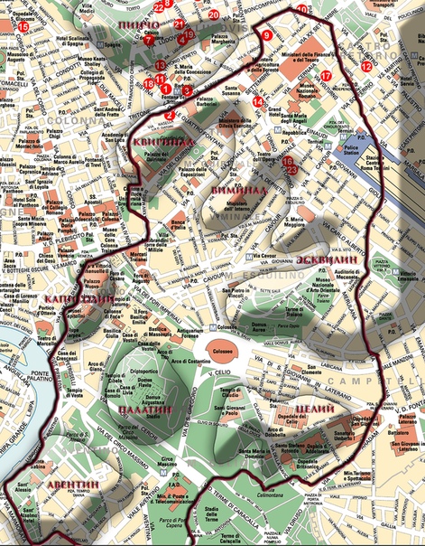 Пантеон — 10. Фонтан Треви — 11. Площадь Маньянаполи — 12. Улица Национале — 13. Улица Панисперна — 14. Базилика Санта-Мария-Маджоре — 15. Улица Кавур — 16. Площадь Четыре Фонтана — 17. Площадь Республики — 18. Церковь Санта-Мария-делла-Виттория — 19. Палаццо Барберини — 20. Фонтан Тритон — 21. Площадь Тринита-деи-Монти — 22. Вилла Боргезе — 23. Вилла Медичи — 24. Площадь Пополо — 25. Ватикан — 26. Замок Святого Ангела — 27. Район Трастевере — 28. Термы Каракаллы — 29. Базилика Сан-Джованни-ин-Латерано — 30. Базилика Сан-Паоло-фуори-ле-Мура
