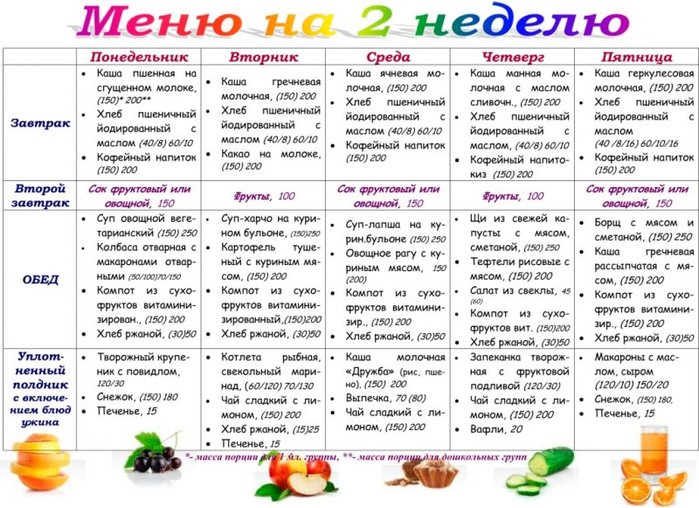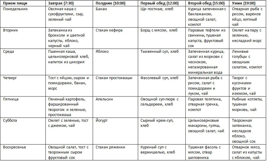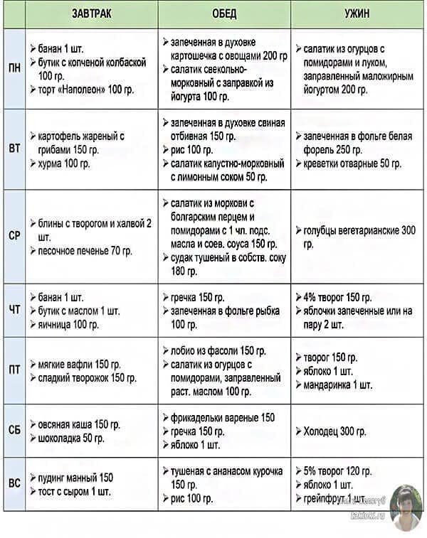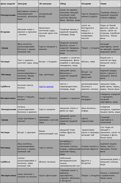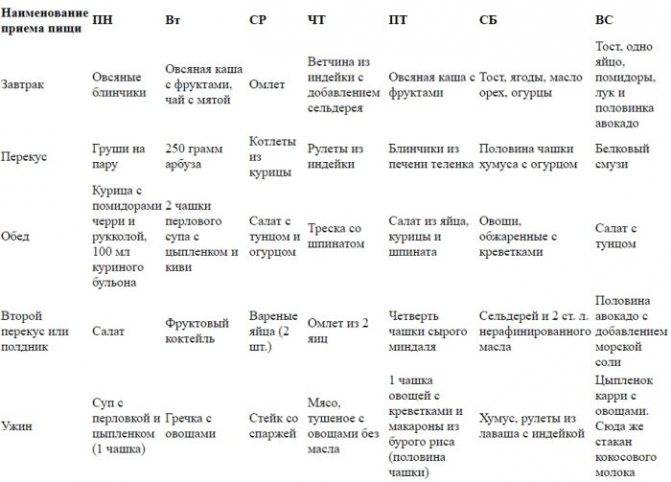 Давайте рассмотрим примерный недельный рацион питания, составленный таким образом, чтобы количество углеводов в сутки не превышало нижнего порога в 30-40 баллов.