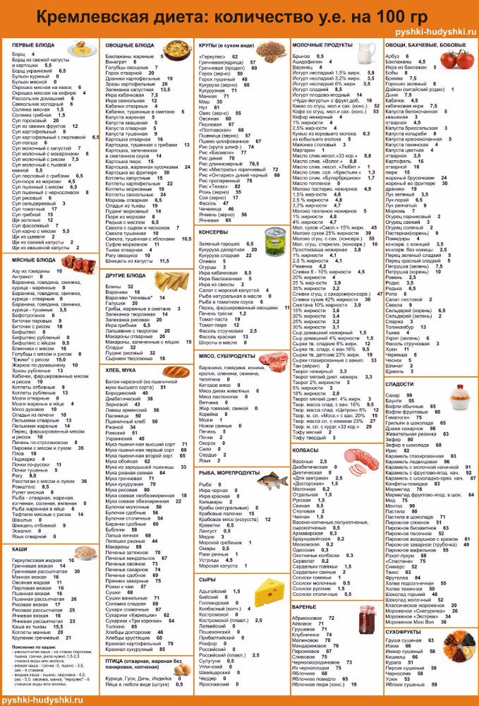 Недостатки Кремлевской диетыКремлевскую систему питания называют также вариантом весьма популярной на Западе диеты доктора Аткинса, которую многие специалисты считают вредной, провоцирующей заболевания сердечно-сосудистой системы и приводящей в конечном итоге к инфаркту.Низкоуглеводные диеты опасны тем, что организм теряет кальций, который вымывается из костей, что ведет к остеопорозу, и у человека появляется предрасположенность к переломам костей. Кроме того, может развиться коронарная болезнь сердца. В результате употребления большого количества мясной пищи в организме человека образуется мочевая кислота и возрастает концентрация кальция в моче, что может привести к образованию камней в мочевыводящих путях. Также существует риск развития подагры. Как правило, нехватка в организме воды и крайне малое содержание в употребляемой пище растительных волокон, необходимых для обеспечения нормальной деятельности кишечника, грозят нарушениями активной работы кишечника и приводят к запорам. Так что, назвать Кремлевскую диету хотя бы безвредной, никак не получится. Но, она достаточно эффективна (в разумных пределах) и легко переносится — о голоде можно и не вспоминать. ———————————- Несколько рекомендаций — Соль в этой диете, в отличие от сахара, “белой смертью” не является. — Ежедневно выпивайте 1,5-2 л чистой негазированной воды. — Ни в коем случае не становитесь фанатом похудения и не сокращайте количество “условных единиц” до минимума — организм должен получать все необходимое. — Не стремитесь есть только низкокалорийные продукты — сочетайте их с высококалорийными. — Не отказывайтесь совсем от овощей и фруктов, иначе вам не будет хватать витаминов. Таблица кремлевской диеты полнаяЦенность 100 г продуктов и готовых блюд в условных единицах (у.е.) (это самый большой список баллов кремлевской диеты который я видела)