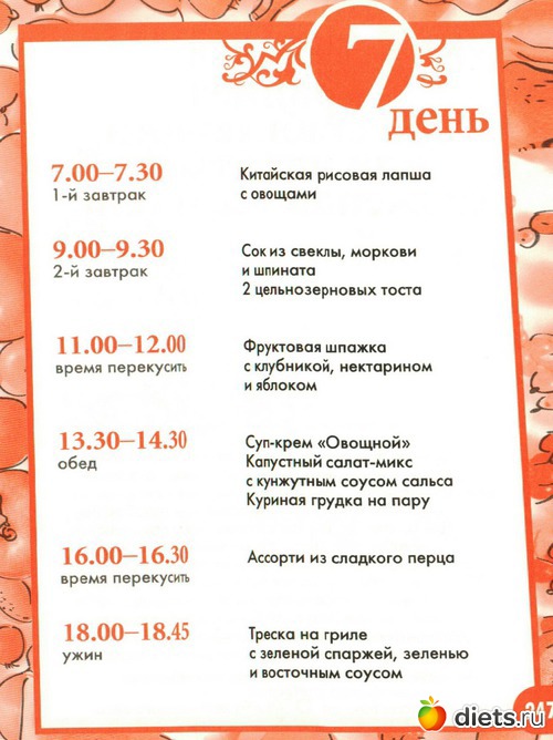 — салат с соусом из лососяДень 7 1 чашка черного кофе или зеленого чая без добавления сахара — Пропустите обед и выпейте много воды. — 200 г Баранина на гриле