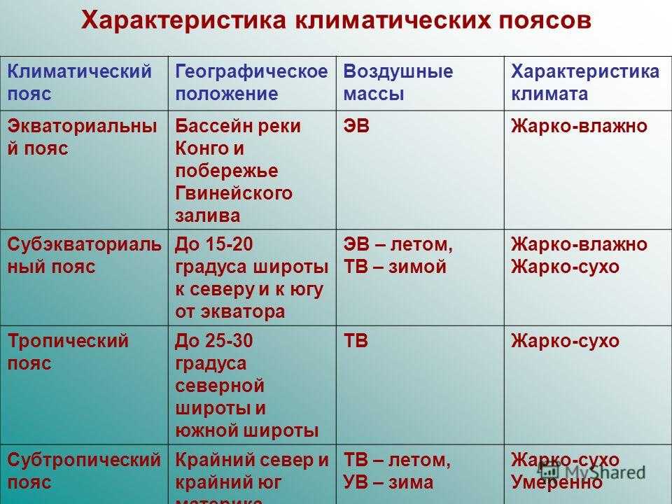 В пределах каждого пояса выделяют зональные типы климата, сменяющиеся в направлении с севера на юг, и климатические области, направленные с запада на восток. Влияние на климат России оказывают такие факторы, как рельеф и близость к океану. В таблице представлены климатические зоны для разных регионов страны.