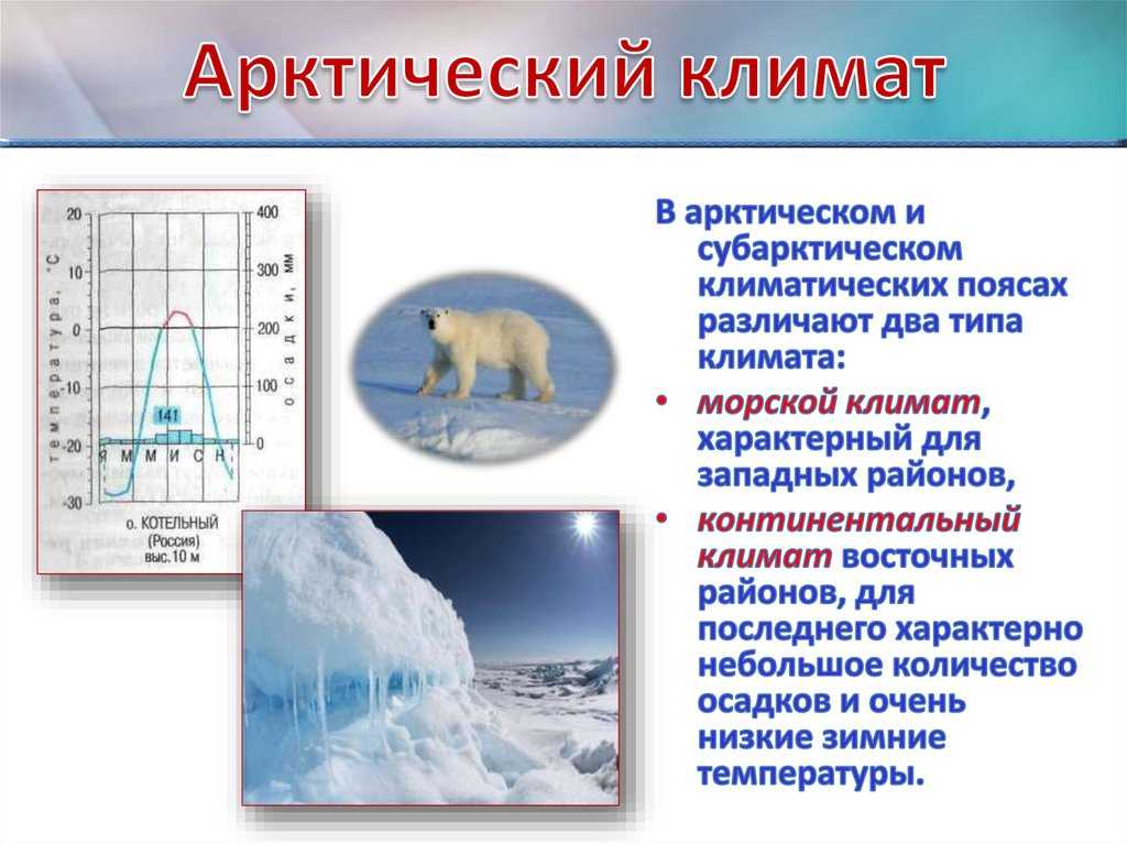 Он характерен для побережья Северного Ледовитого океана России и для островов, расположенных в океане. Круглый год в пределах этого климата господствуют арктические воздушные массы. Зимой температура опускается до -40-50°С, а летом бывает не выше 4°С. Значительная часть солнечной радиации отражается поверхностью снега. С прохождением циклонов здесь связаны облачность, ослабление морозов и сильные снегопады. Количество осадков-до 300мм, однако, увлажнение избыточное из-за низкой испаряемости.