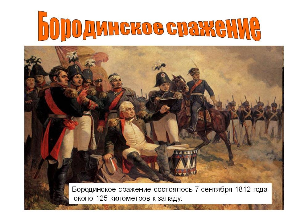 Далее объединенная русская армия двинулась в село Бородино, что в 125 км от Москвы, где произошло знаменитое Бородинское сражение 1812 года.