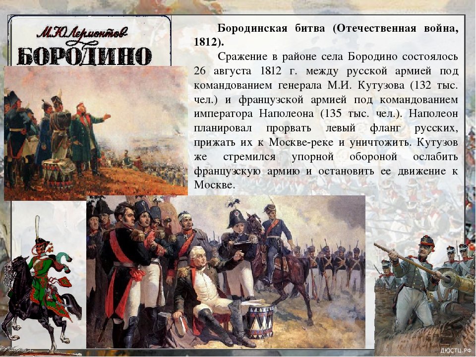 Л. Н. Толстой и Оноре де Бальзак, А. С. Пушкин и Проспер Мериме (и не только французские и русские классики) написали гениальные романы, рассказы, очерки, посвященные этой легендарной битве. А вот стихотворение «Бородино» М.Ю. Знакомый с детства Лермонтов, при всей его поэтической гениальности, легкости чтения и доходчивости, по праву может считаться хроникой тех событий и называться «Бородинское сражение 1812 года: краткое содержание».