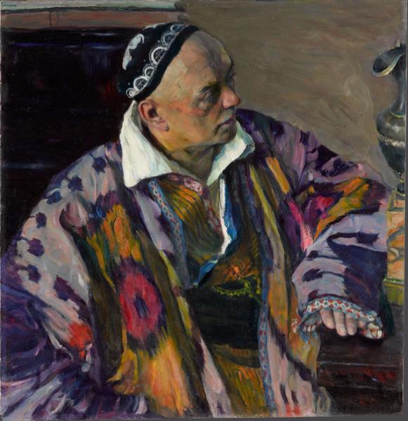В «Завтраке аристократа» цветовое единство строится на основе доминирующего зеленого цвета интерьера. Контрастом этому зеленому звучат синий цвет халата и малиново-красный – шелковых шальвар «аристократа». Каждый цвет необычайно интенсивен, полнозвучен, что, не мешает цельности общего цветового решения.
