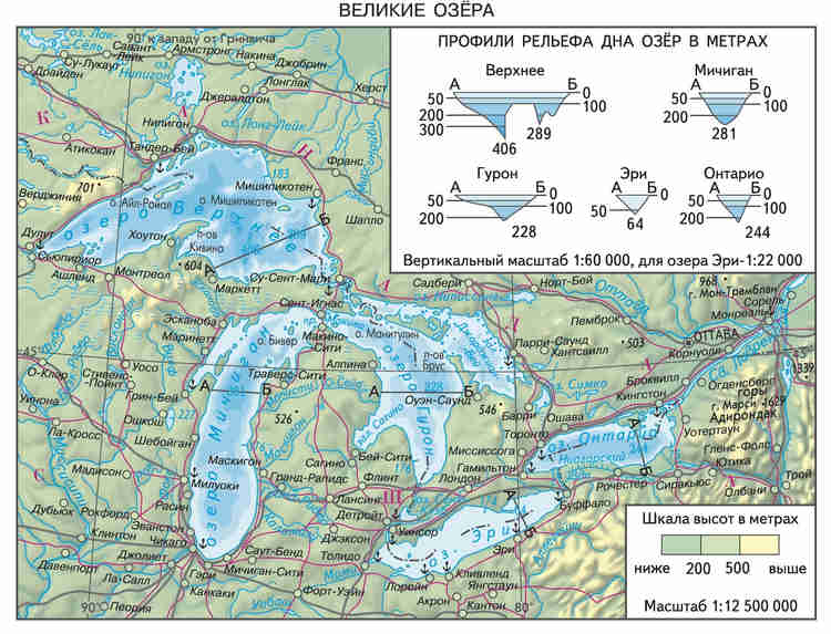 Верхнее озеро на картеВерхнее озеро – это не только крупнейшее озеро в системе пяти Великих озер Северной Америки, но и самое большое пресноводное озеро мира. Ограниченное на востоке и севере провинцией Онтарио (Канада), на западе – штатом Миннесота (США), а на юге – штатами Висконсин и Мичиган (США), оно соединяется с озером Гурон через реку Сент-Мэрис. Озеро имеет длину 563 км (с востока на запад), а его наибольшая ширина составляет 258 км (с севера на юг). Верхнее озеро имеет среднюю высоту над уровнем моря 180 м и максимальную глубину 406 м. Объем озера составляет 12 тыс. км³, а площадь – 82,1 тыс. км². Ежегодные колебания уровня озера составляют менее 30 см.