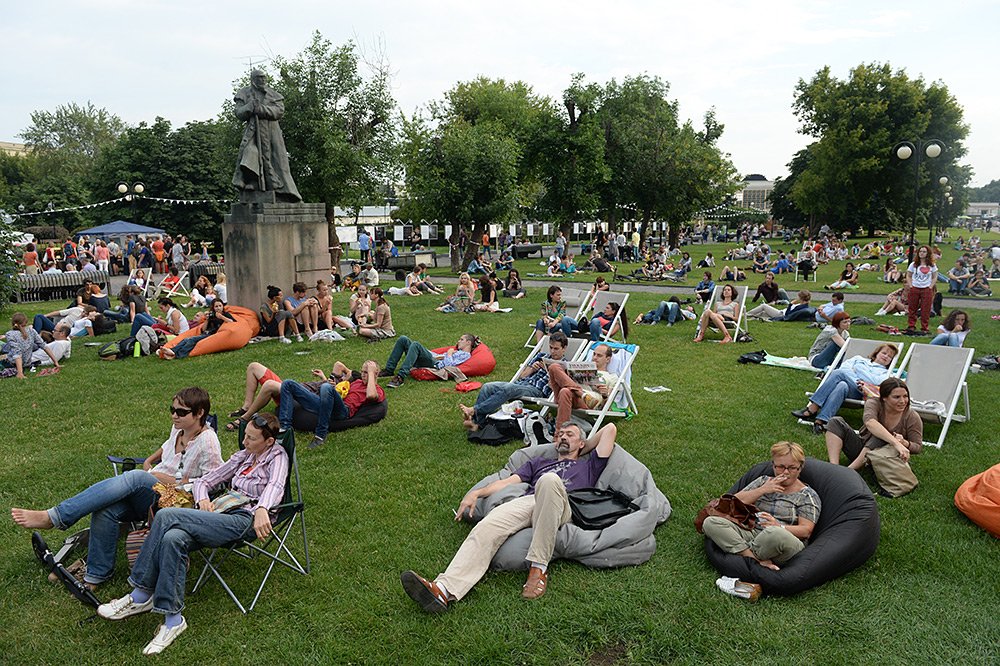 Летом здесь работает бесшумный кинотеатр под открытым небом «SUMMER TIMES» (звук транслируется через наушники). На большой лужайке стоят надувные яркие пуфы. Зимой на их месте заливается каток.