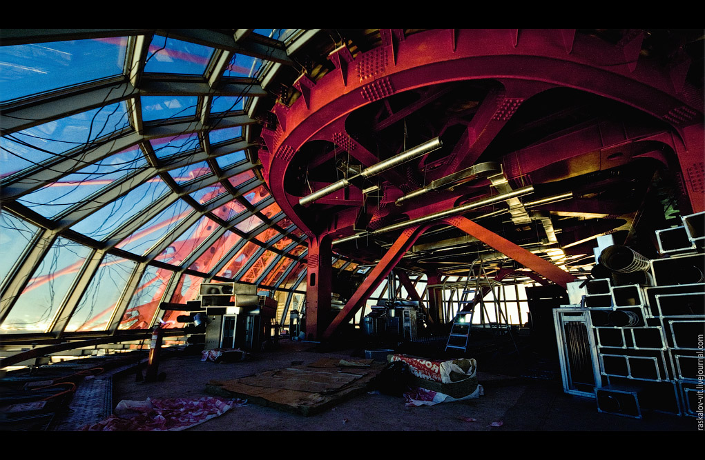Сейчас телевизионные трансляторы с горизонтальной поляризацией установлены на пятом этаже. Конструкция проекта Никитина с конусообразным основанием («перевернутая лилия») доказала свою надежность.