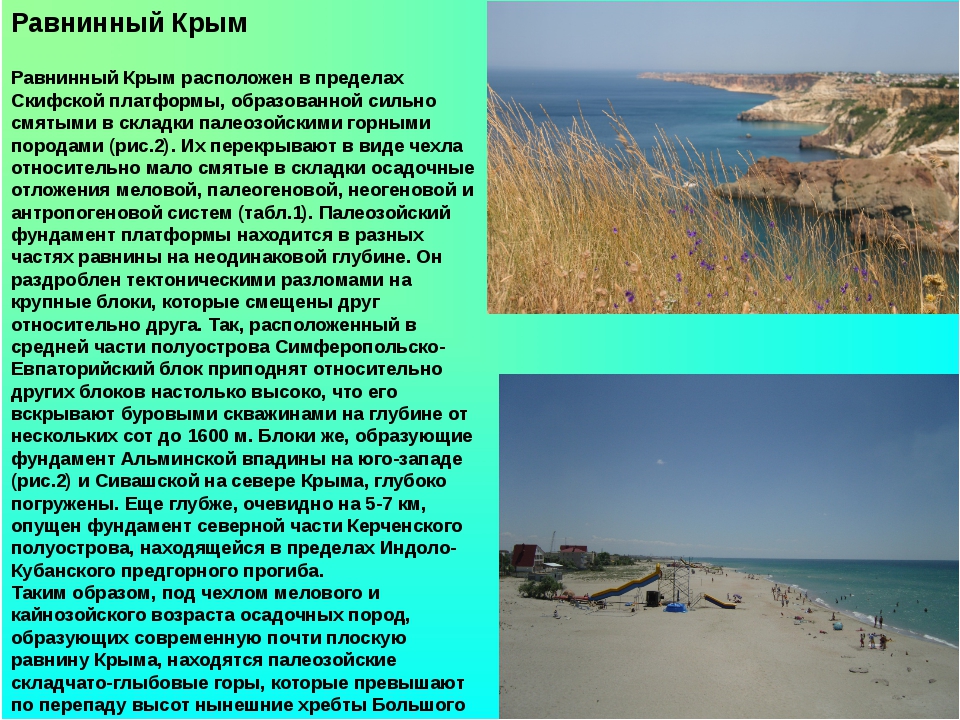 Рельеф. Равнинный Крым мало отличается от степей соседних областей России и Украины, но на западе они переходят в известняковые уступы Тарханкута, а на востоке — в холмистые гряды Керченского полуострова.