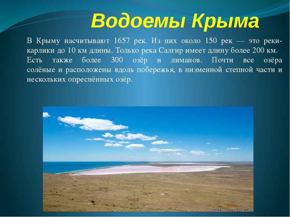В горном Крыму озер нет. В северной равнинной части полуострова, в прибрежной его зоне, расположено более 50 соленых озер, средняя глубина которых всего 1 метр. Вода соленых озер, так называемая рапа, представляет собой концентрированный раствор солей хлора, натрия, магния и других элементов. Рапа озер, и особенно Сиваша, используется в химии. На дне некоторых крымских озер толстым слоем лежит грязь (ил), обладающая целебными свойствами.