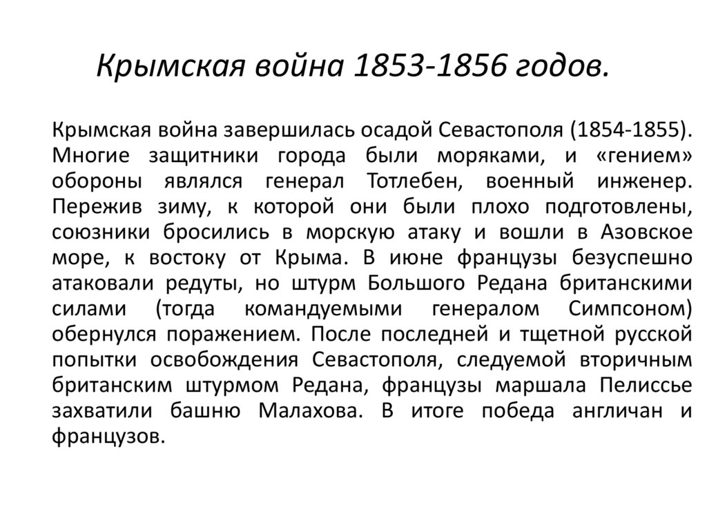 Трехсотсорокадевятидневная оборона Севастополя превосходит Бородино!», — говорилось в приказе по армии от 30 августа 1855 г. Союзники потеряли за время Севастопольской обороны 72 тыс. чел. (не считая больных и умерших от болезней). Русские — 102 тыс. чел. В славную летопись этой обороны вписаны имена адмиралов В.А.Корнилова и П.С.Нахимова, инженера Э.И.Тотлебена, хирурга Н.И.Пирогова, генерала С.А.Хрулева, капитана Г.А.Бутакова, матроса П.М.Кошки, офицера А.В.Мельникова, солдата А.Елисеева и многих других героев, объединенных с той поры одним доблестным именем — «севастопольцы». В Севастополе появились первые в России сестры милосердия. Участники обороны награждены медалью «За защиту Севастополя». Оборона Севастополя стала кульминацией Крымской войны.