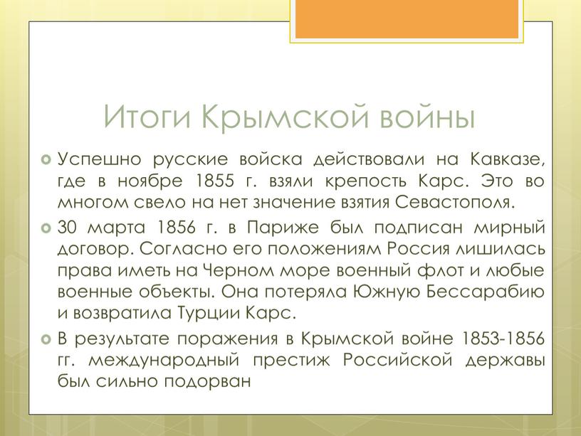 По Парижскому договору (1856) России возвращался Севастополь в обмен на Карс, а земли в устье Дуная передавались Молдавскому княжеству. России запрещалось иметь на Черном море военный флот. Россия также обещала не укреплять Аландских островов. Христиане в Турции сравниваются в правах с мусульманами, и дунайские княжества поступают под общий протекторат Европы. Парижский мир, хотя и не выгодный для России, был все-таки почетным для нее ввиду таких многочисленных и сильных противников. Впрочем, невыгодная сторона его — ограничение морских сил России на Черном море — была устранена еще при жизни Александра II заявлением 19 октября 1870 года.