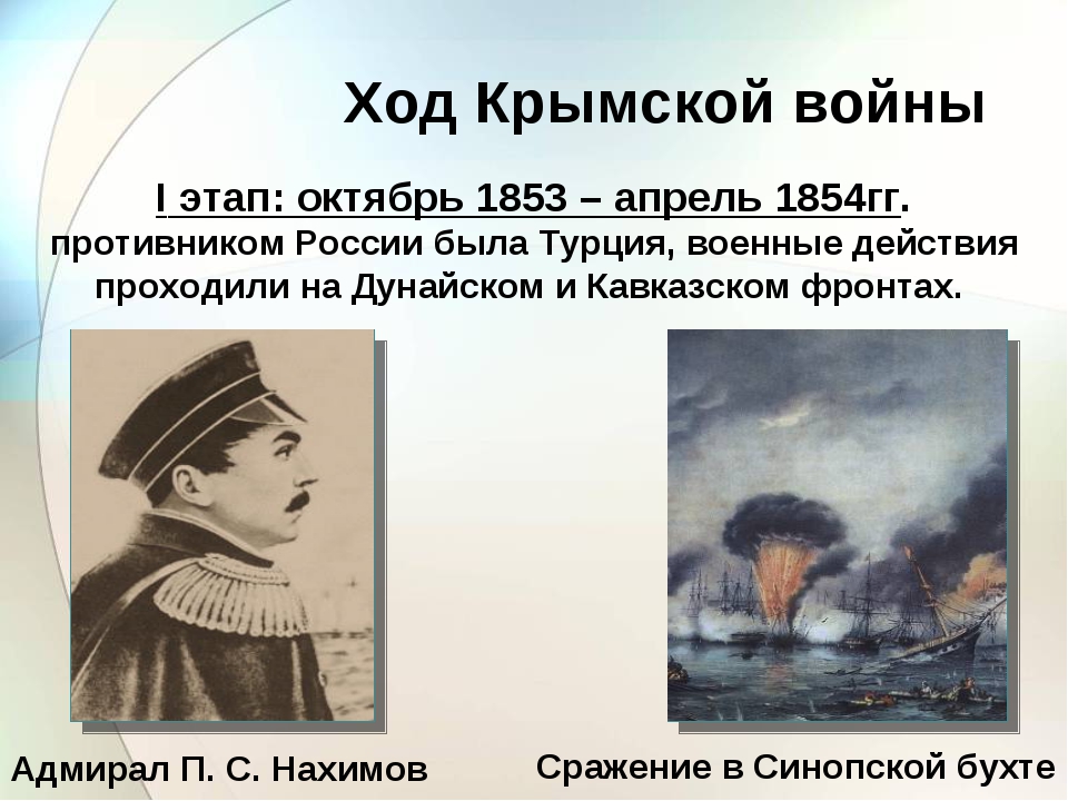 Синопское сражение (1853). Тем временем в Синопской бухте произошла битва, ставшая самым ярким событием этой несчастливой для России войны. 18 ноября 1853 г. черноморская эскадра под командованием вице-адмирала Нахимова (6 линейных кораблей, 2 фрегата) уничтожила в Синопской бухте турецкую эскадру под командованием Осман-паши (7 фрегатов и 9 других судов). Турецкая эскадра направлялась к побережью Кавказа для высадки крупного десанта. По пути она укрылась от непогоды в Синопской бухте. Здесь ее 16 ноября блокировал российский флот.